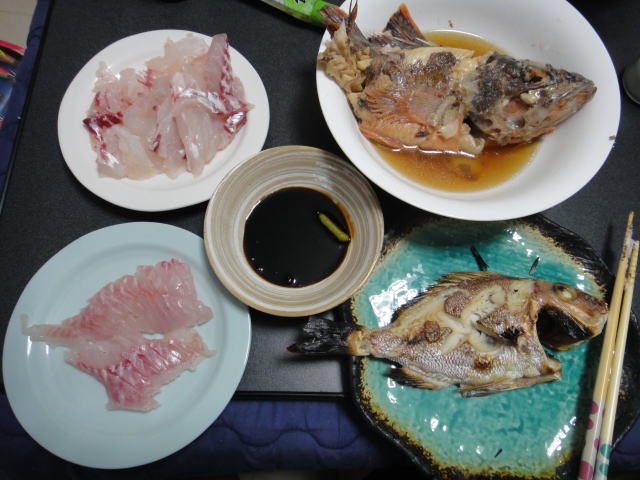 マダイ、アラカブの刺身、マダイの塩焼き、アラカブの煮付けを頂きました。