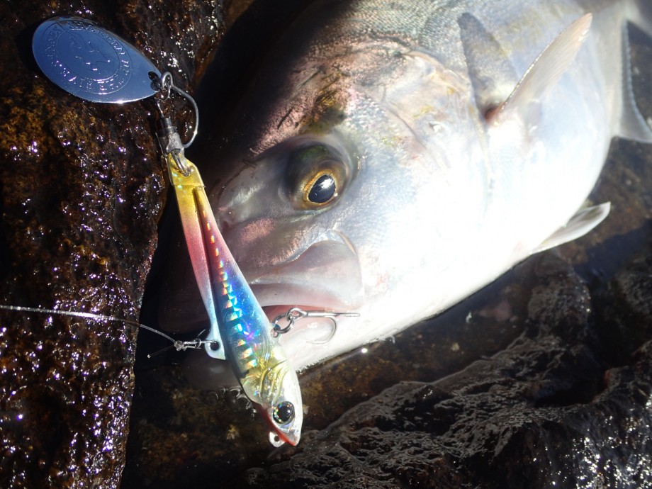ちょうど潮目も射程圏内に入ってきたので、ビッグブレードの魅力を発揮してもらうべくフルキャストし着底を待ち、リトリーブしていきます。ブレードが大きいので、ゆっくりとリトリーブしてもブレードの回転を感じやすく、テンションフォールでも十分に伝わってきます。そんなブレードの回転を感じながらのフォール中に、ロッドをひったくるようなアタリがあり、すぐさまフッキングです。