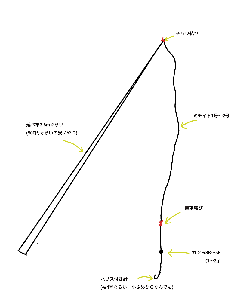 結ぶのは竿とミチイトを結ぶのと、ミチイトとハリスを結ぶ2回ですが、ググって動画見せて何回か練習してもらったらだいたい出来るようになります。