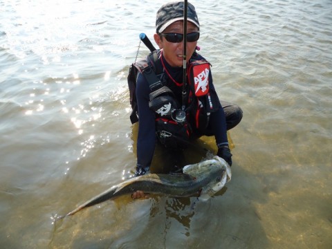こんばんは!週末アングラーの汗だくマーミーです。今日は下流へエントリーしましたが、自分にはチーバス君からの暑~い洗礼を(サルベージを持ってかれました泣・・・)。まわりの皆さんの釣果をみてうらやまし~ナ~・・。上流でがんばるか・・。いつものポイントへ・・。先行者の方1名後から1名、先行者の方でっかいのぶらさげてます・・近寄って聞いてみると90UPスーパーランカー!!おめでとうございます。おじさんはしもでがんばります(凹)。昨日よりチョイ上流ですがあるんだな~こんなことが