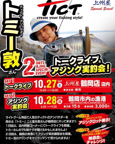 今週27日(土)・28日(日)のトミーさんは♪こんばんは^_^今週27日(土)・28日(日)は山形県の上州屋鶴岡店様のイベントにトミーちゃんと僕とで参戦します♪27日(土)トミー敦のトークショー、じゃんけん大会、抽選会28日(日)アジング実釣会※定員数があります僕が監修した12月発売予定のメバルロッドIC-90Tも展示しますのでぜひ振って曲げちゃってください^_^当日お待ちしておりまーーす♪