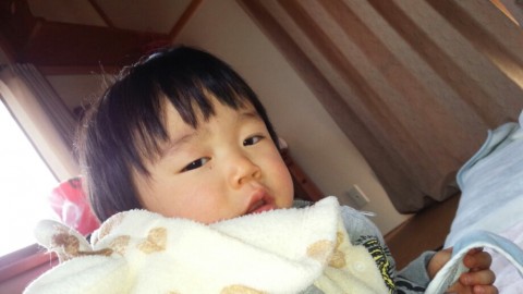 そんな眼差しの息子、リンゴを餌に黙らせ、一人で黙々たべました!(笑)
