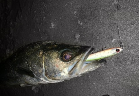 沖にいい流れを感じて、月が隠れ辺りが一瞬暗くなった頃にリアルカラーからルアーをチャート系に変更して2投目。。レンジを保ちつつ、フワフワと群れから離れたイワシが泳いでるイメージでドリフトさせて行くと…ガツン‼️