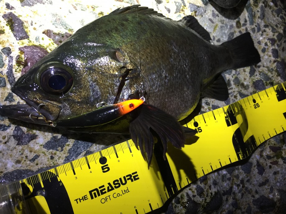 着水直後の秒速1mくらいの早巻きでドスンと丸呑み。今まで経験した事がない食い方。しかも尺メバル。