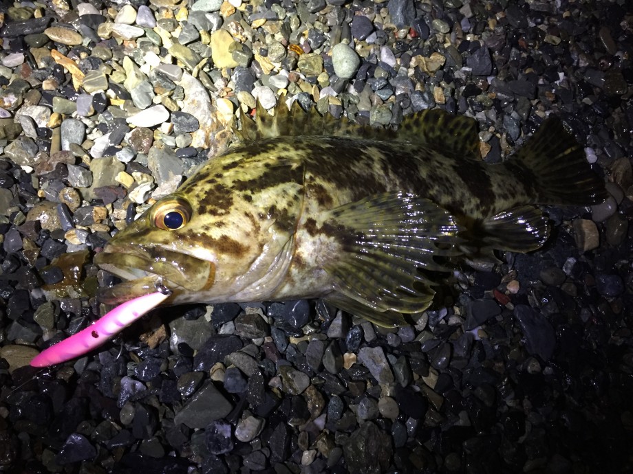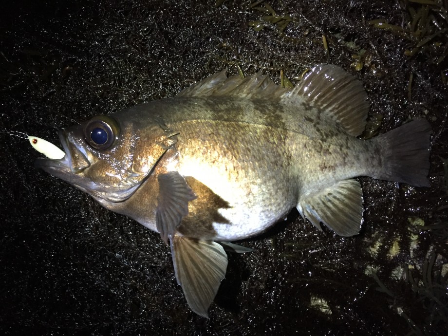 【月夜、やや曇り、ウネリ1.5m、ユーリを引き波で送り込み、絶妙にライジングしたと思われる。おそらくウィードの上っ面「モソッ」としたデカメバルバイト】