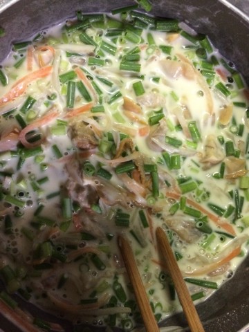 やはり100円ローソンの天麩羅粉を適度なゆるさに溶き、具材を投入。まぜまーぜ。