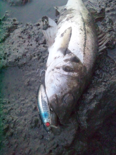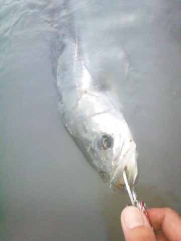 沖のスリット上にキャストし、2~3回ジャークを入れ魚に気付かせてから、ただ巻きで手前シャローまで引いてくるとゴツンッ♪