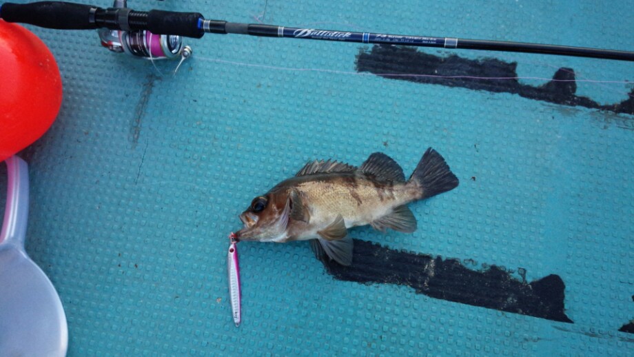 前回同様、落とし込み仕掛けでメジナ狙い。相変わらず釣れまくるメジナに混じって義父にアジが来たので、キャロと5gジグで狙うも、キャロにメバルとカサゴのみ。
