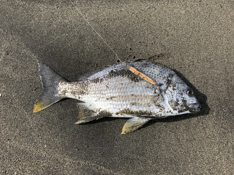 上げ潮になり、上流部に遡ってくるキビレをレアリスポッパーでゲット。