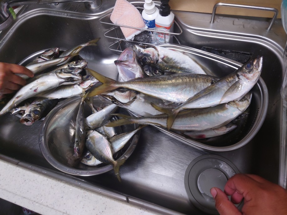 クーラーはアジでいっぱい、帰宅後のシンクは写真の通り大漁の光景(笑)。捌くのは大変ですが、刺身やなめろう、南蛮漬けで美味しくいただきました。
