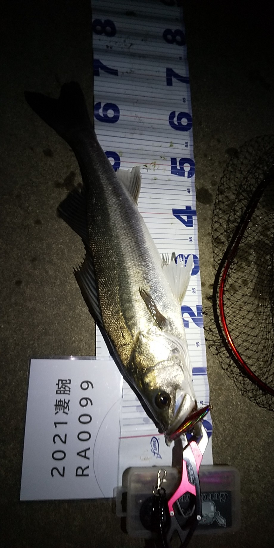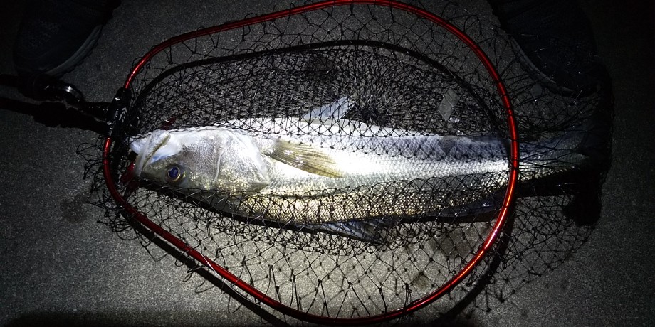 魚のほうは,絶対ルアーに引っかからない自信があったようで,ものすごく引きます.手前に寄せてからもよく暴れました.ネットが小さ目のキビレ用なので,入れるのもなかなかでしたが,試行錯誤してようやく入り,引き上げました.このとき,前回ネットが折れているので,補修したネットが折れないよう,垂直に上げるよう心掛けました.