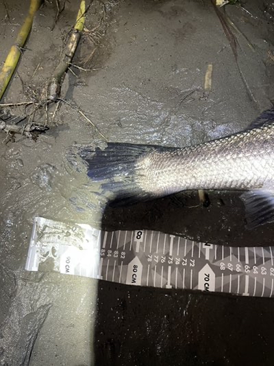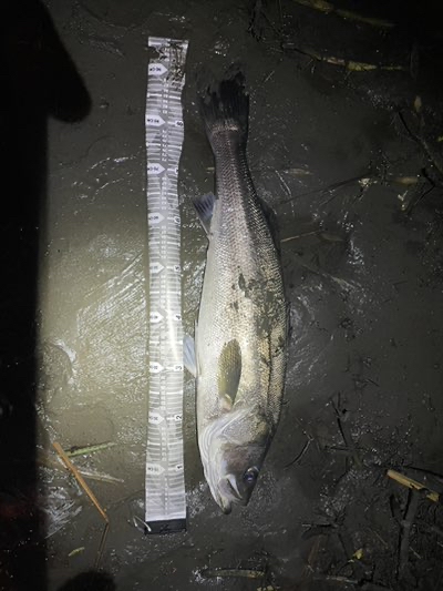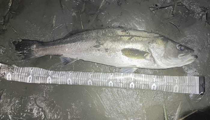12月の頭、ラブラックスMHとセルテート5000番でビックベイトや120mmサイズのルアーで探っていましたがほぼ反応なし。前日もコノシロの群れを発見したもののそれにシーバスが付いてる感じもありませんでした。一方で小さめのベイトをたくさん確認したため、小さいベイトを偏食してる可能性を考慮しこの日だけ天龍SWAT93lmlにエアリティ4000のタックルでポイントへ。シーバスがよくついている場所にvj12を通すと3投目でゴン!全く浮かなかったためデカいと確信しました。手前まで寄せて目視すると「ん?年無しチヌのスレか?」と思いましたがそれはシーバスの頭部の一部にすぎませんでした。エラより前だけで年無しチヌくらいのサイズ感、そして旬のブリのような丸々太った巨体。とんでもないものを掛けたと思いながら必死にファイト。めちゃくちゃ走られますが強引にファイトせずとにかく竿を水面に平行にしてドラグを出させスタミナが切れたところで一気に巻いてランディング。実はつけていたフックは安物の10番フックでしたが全く伸ばされていませんでした。さすが天龍SWAT。次はメーターオーバーを狙いたいです。
