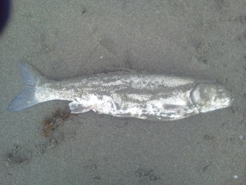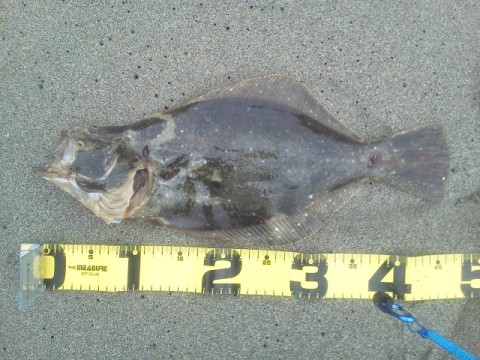 喰った喰ったと2人に報告して手前10mぐらいで、生体反応がなくなり、そうですバラしっす(泣)気を取り直しキャストをしてると、すぐに当たりが!ゴンっキタ~今度はバラさないよ~と慎重にランディング、んっ?引きが弱わ~、手前で姿が、もうお分かり、ソゲっす(泣)その後変な当たりが連発、なんだぁ?なかなか乗らない?後から来たHさんのロッドが満月に、ドラグ出まくりでなかなか寄って来ない、ヒラメなら60upはあるはず、みんな注目して見ている、手前に来るとやっと姿が、シーバスだ~砂浜にズリ上げると、なんかおかしい?口がおちょぼ口、マルタです、60upそれもおっぽ近くのスレ、そりゃ引くはずです。変なん当たりの正体はマルタでした、ガツガツ当たり、かなりの群れで居る感じでした。みんなでマルタ計3匹、よしくんが舌平目、結局8時半まで粘って誰も当たりなし、悔しいですが、なんか楽しかったです!! またまたいっとーくんにヒラメ頂きました、あざっす(笑)