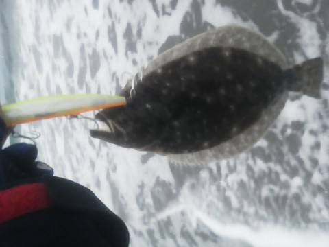 4時に入りました、久々の暗い内のサーフ、なぜ頑張って早く入ったかというと、潮が上げで満潮近くに魚が手前に寄ってるのと、引きに入ると水が薄くなり魚が沖の届かないポイントに行ってしまうから。後一番のカレントに入る為。サーフに降りると既に二人が一番のカレントに、よしくんと、いっとーくん、何時に入ったのか?仕方なくちょい深そうなポイントで開始、暗い内は必ず烈風120チャート、徐々にカレントに近づいて、2人に挨拶、オハヨー今日は一番乗りだと思ったよ~、2人は苦笑い、だんだん明るくなり流れも良い感じに、すると真横のいっとーくんにヒット!見事40up、シマノヒラメリミテッドー120、ヒラメゴールド、前日も10人ぐらい居たなか、ただ一人40upを釣ってる余裕なのか、ヒットルアーはアクシオン、リアルイワシ。すると自分にも、ガツっ!きた~