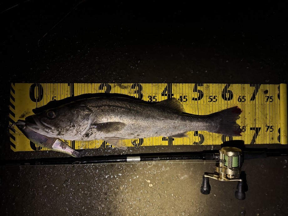 暗闇からルアーが頭を出しかけた所でドスッという衝撃が手元に伝わると同時に、鈍い銀色のどデカい光の塊が水中に見えた。