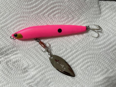 とか思いつつ、バス用ルアーかな?ブレード支えで浮くやつを見て『これをフローティングミノーでやれんじゃね?』と参考にしクー100Fでやってみた。