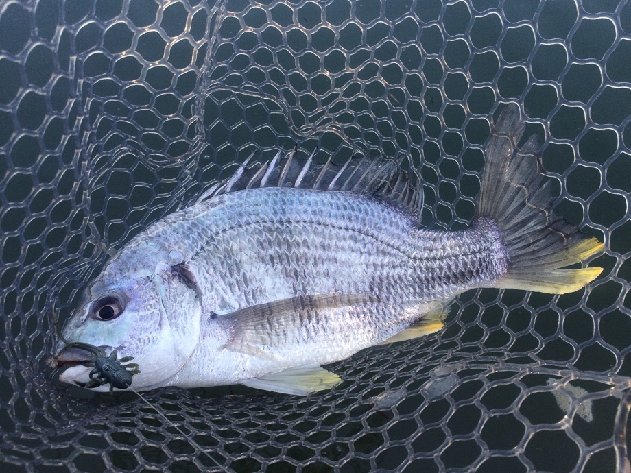 クロダイのプリスポーン(ハラミ)と言えば、低水温な時期も重なり、ただ重たいだけのイメージがありますが、高水温期に産卵を迎えるキビレは強烈なファイトに重量感が入るので、最後まで浮かないし、空気を吸わせても全然バテない。
