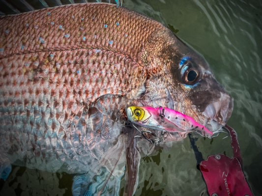シーズン初めは、少しレンジを入れてやるとマダイの反応が良いので、ONIMARU 20g・30gを流速と水深にあわせて選択する。
