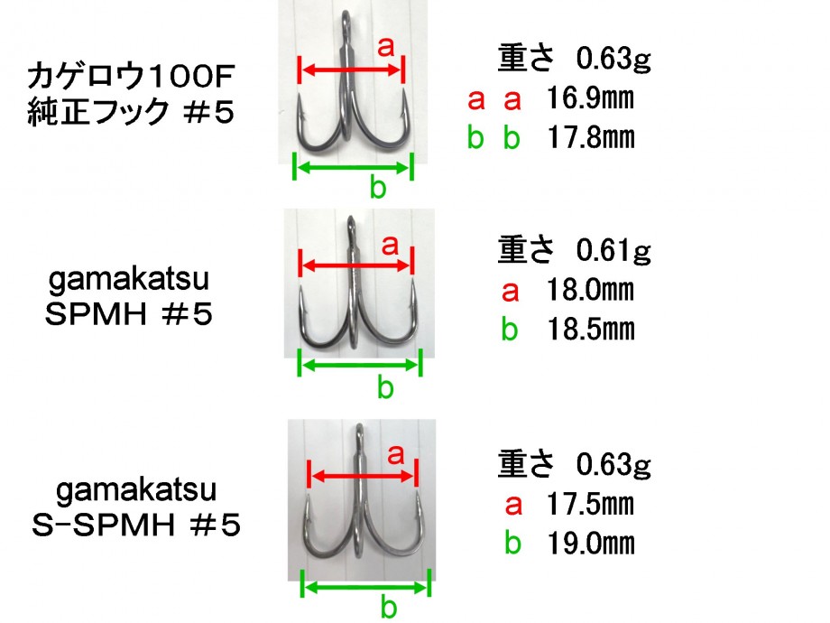 カゲロウ100F・カゲロウMD98Fの純正フック・SP-MH・S-SPの形状や重さを比べてみました。