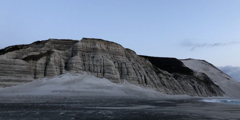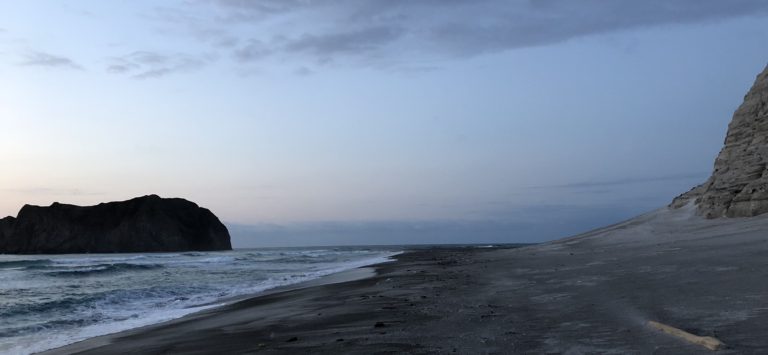 波の轟音の切れ間に、「コロコロコロ…」と小石が転がる音が暗闇の中を漂う。