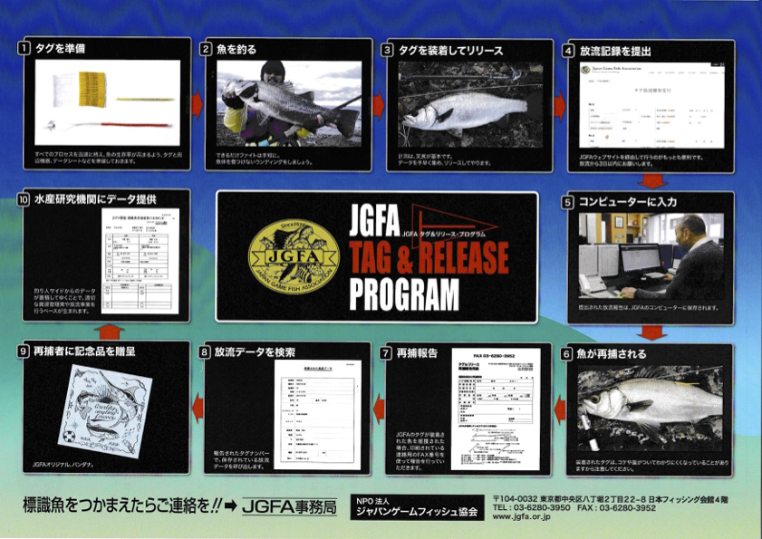 私はJGFAからは離れてしまったのですが、クラブメンバーの中には継続しタグ&リリースをされている人もいるので、タグの付いたシーバスを採捕されましたら、JGFAの方までhttp://www.jgfa.or.jp/usr-data/template/jgfa-sec_8/common-img/system.jpgご連絡をして貰えると嬉しいです。 JGFAホームページに採捕報告する欄がありますので、そこからされると良いと思います。