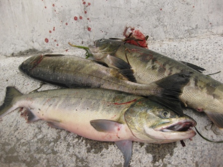次に穴場の漁港を覗いてみたらゆっくり泳ぐ30本位の鮭の群れ発見!この時点でB回避決定(笑)勿論秒殺で3Get!