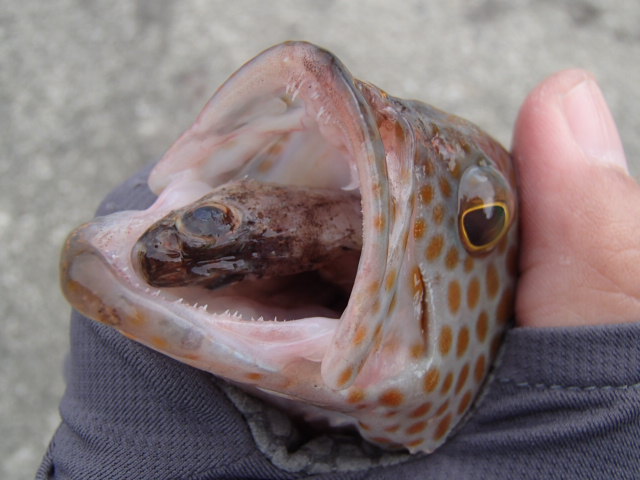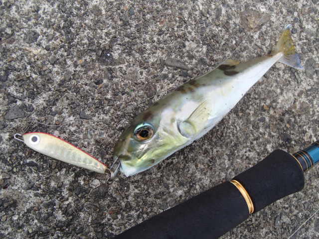 変わり種としては、シロサバフグと思われる魚がメタルジグにヒット。しっかり口にフッキングしていた。ヒットルアーはスミスのメタルシャッド。