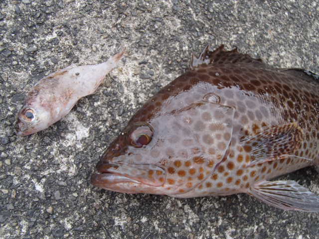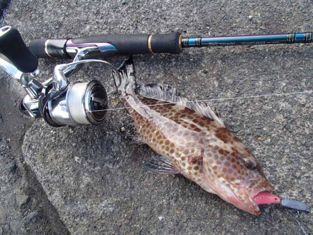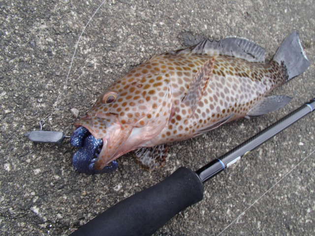 6月のアジング大会で訪れたポイントで竿を出し、今回の釣り旅最大となるオオモンハタ。