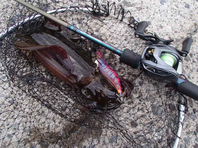シモリの際をドリフトさせて、良型アオリがヒット。
