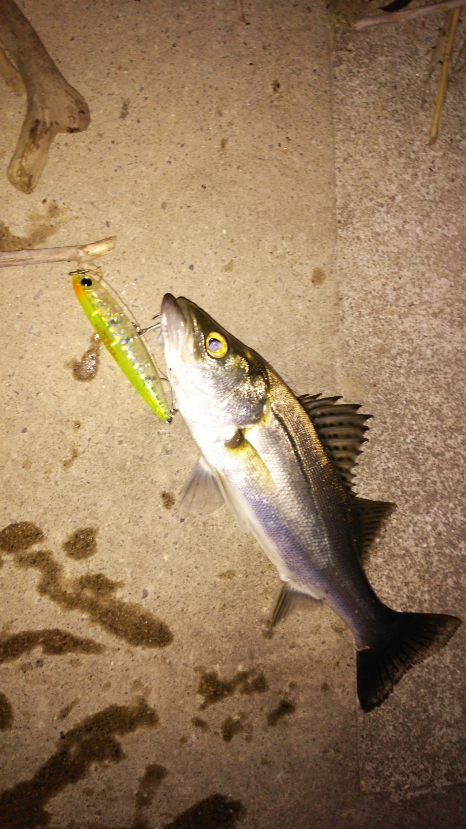 多分シーバスと思われる魚がヒットした様子!後からどのように釣ったのか聞くと茂みの深い所に、ワイドするとヒットしたとの事。相変わらず、いつも先にヒットするねぇ(^o^)