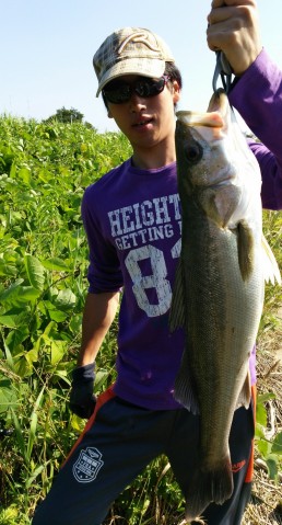 「来たぞ!!」と言うと「まじか」と源三が驚いてこっちにくる。シャローで根が多い場所なので、いつ潜られるかヒヤヒヤしながらバトル開始!時折見せる大きなエラ洗い!「デカイ、デカイ」と叫びながらスリルと強烈な引きを楽しむ!5分ほどしてなんとかランディング(^-^)