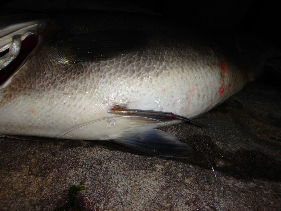 これはシーバス。タレ大接岸以来のこの腹(笑)
