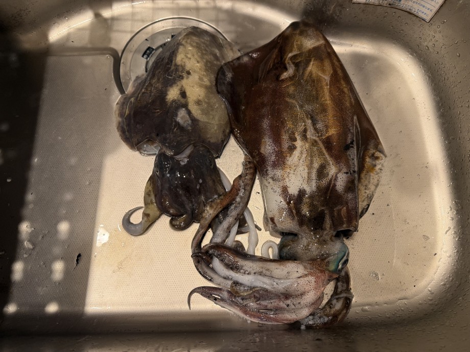 こりゃでかいかも?と慎重にやりとりし、走るのが止まるまでドラグに手を掛けず、ランが止まってから1ノッチずつドラグを締め、テンションが抜けないようにポンピングせずひたすら巻いてきました。こういう時にPCLT3000は楽々で全然巻けましたね。EGTR-XXも全く問題なしです。さて、船縁での抵抗をこらえてネットインしたアオリイカは立派なオスで、確実にキロアップ!やっと釣れました。その後は細かい当たりあるものの、これまた乗らず、やっと当たったのはキロくらいのモンゴウで、その後の追加ならずで13時半冲上がりとなりました。後の計測でキロアップどころか1.74キロと春イカサイズでした。晩秋にはキロアップも釣れていますが、1.74キロはほんと想定外でした。澄み潮や水温は慣れてくれば食いは立つのでしょうが、ここ数日水アカ酷く、それが釣果に影響している気もします。