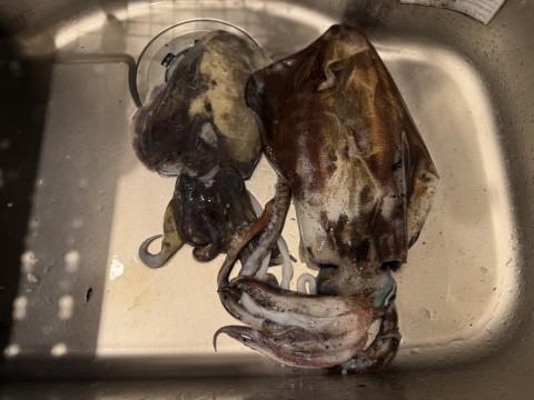 11月25日(火)お暇をいただき、五エム丸さんにティップランでお世話になってきました。4時着で名簿2番目で、お立ち台は嫌だなとコインパーキングで待っていたら、船宿の駐車場が空いているのでそっちに止めてとなり、コインパーキングは時間が経っていなかったので料金が掛からずで損しなくて済みましたが、行く前に呼び止められ、「何で2番目に書いてあんの?」と。あれ?最初の人間違いかと思い、繰り上げ1番目でトモに陣取りました。6時定刻に出船、夜明け前はネオブラレッドのエギで触りのみ、その後も触りあるものの乗らず。ミヨシ2番目の方が3ハイ掛けていましたが、私の方はと言うと、今日もシャクリ→止めがしっくりこない。これじゃ釣れないだろうなと諦めモードに入ってしまい、長竿に持ち替えたりといろいろ試行錯誤していると、ある時に「ん?軽いぞ?」と思うシャクリ方を見つけたんです。感触は軽いけれど、しっかり竿先はしなっている、エギも動いている感触があり、シンカーがズレた感覚もわかる。もしかしたらこれか?とその感覚を染み込ませていましたが、アタリなく・・・仕方なくエギのサイズを3.5号から3号に落とすことを決断。ちょっとせこい気もしましたが、とにかく釣りたい❗️と背に腹はかえられないので・・・