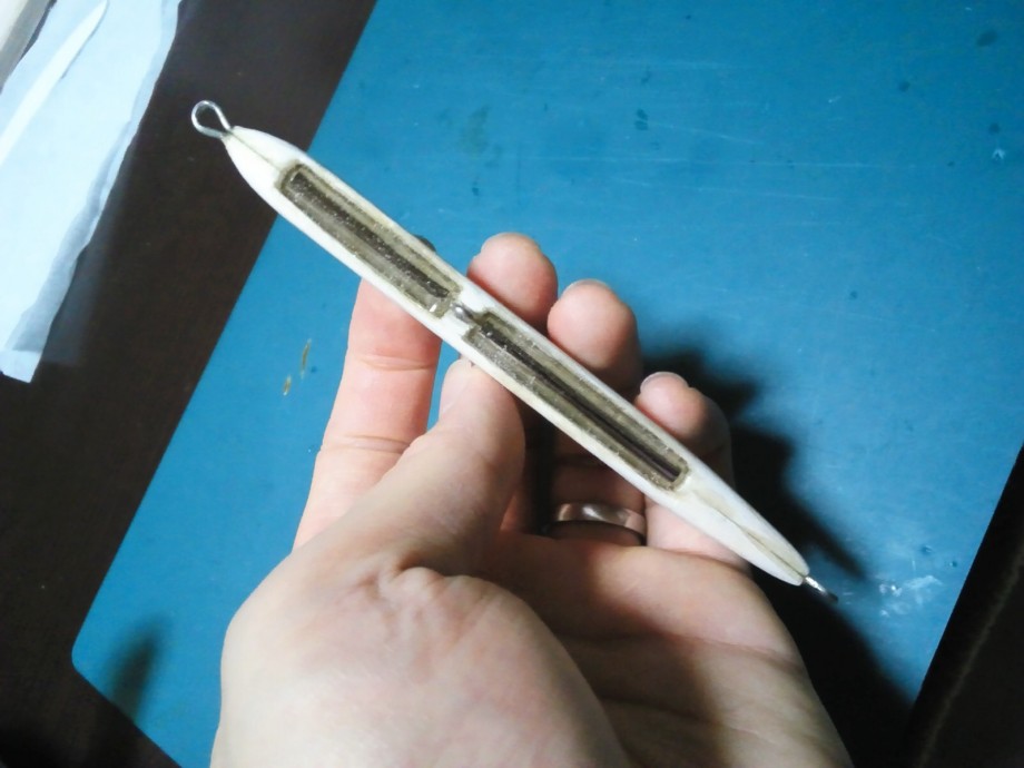 ウェイトを下部に集中させたかったので、削り出してワイヤ通し、貼り合わせた後にウェイトを入れ、エポキシで埋めました。