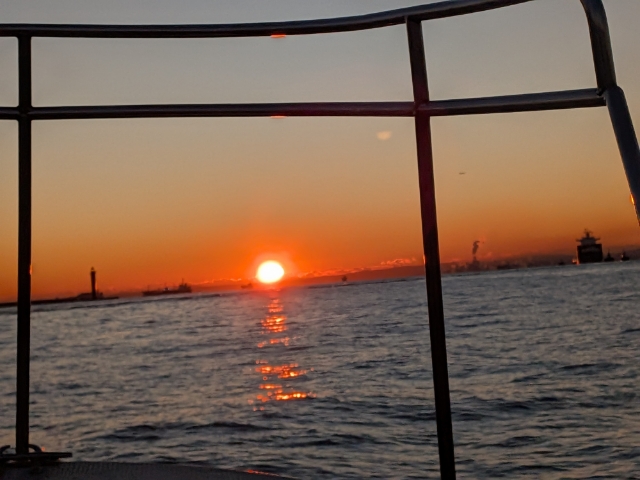 日の出が綺麗なのは三重も東京湾も同じ。綺麗な朝日を尻目に最初に入ったのは沖のバース。