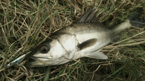 着いてすぐ、水際で翻るシーバスの補食を見つけたので際沿いにキャストし、ジャークを入れる。