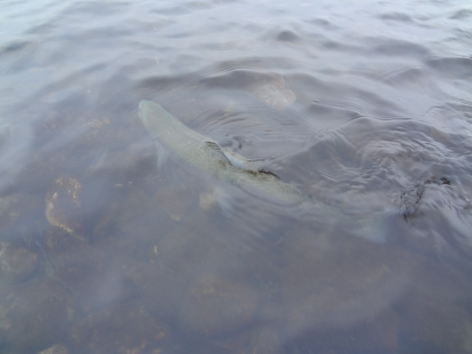 堤の上から、追い風を利用して、5gのイクラスプーンが唸りながら50m以上飛んで入った。