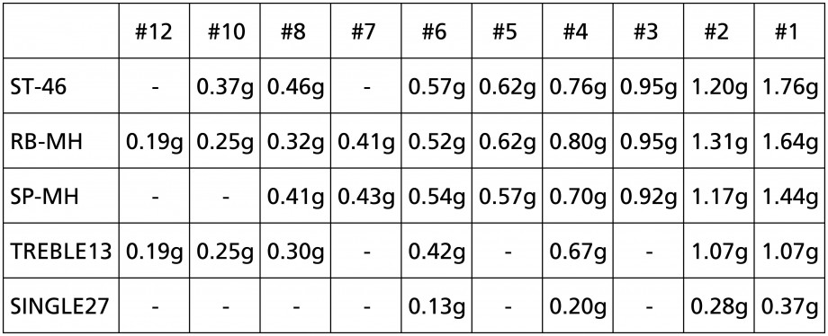 0.01グラム単位まで量れるスケールを持っていませんので、ネットで色々なところへ行ってフックの重さを調べた人がお二人いたので(お一人はfimoの方)それを参考にしています。フックによってお二方の数字が違ってたりするのでどちらを取ったか忘れましたがそう大きくは違わないと思います。ホントは自分で10本ずつ測って10で割る方法で測りたいんですけどね。(ST46を10本買う気にはなれないからやっぱりやらないかな?(笑))