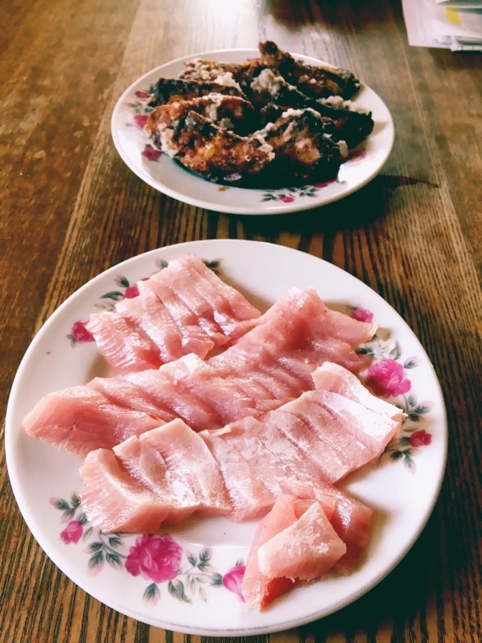 昨日のブリを持って。今日は祖母のために昨日のブリをこしたえかたでした♪ 腹側の美味しい一部分だけ刺身にして、あとは下味つけての竜田揚げに(^ ^) ブリも調理の仕方次第で美味しくなりますね♪ 昨日はブリのせいで辛い思いをしましたが、またちよっと好きになりました(笑) 喜んでもらえて良かった。 また魚を持ってこんならです(^ ^) お昼ご飯美味しかった! ばあちゃんありがとう♪