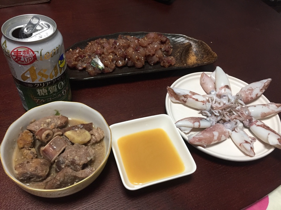 今夜は手作りの鯵のなめろうにバショウカジキの内臓の味噌煮。
