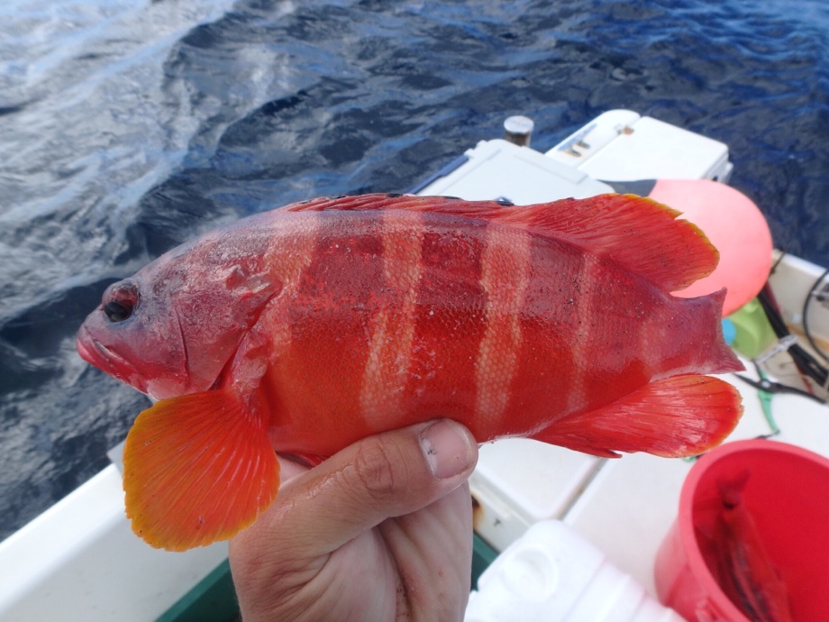 あっちのアカハタモドキは水深が深いところで釣れることが多く、アカハタと違ってデカイのが多いです。