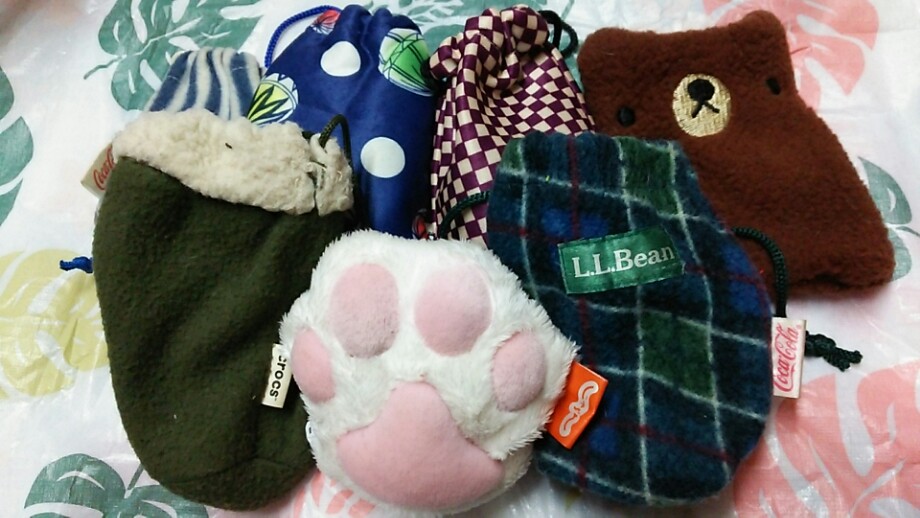 この季節になると、コンビニのホットドリンクにおまけで着いてくる巾着(笑)や100均のアニマル系のチャックのついた袋などです。(ФωФ)
