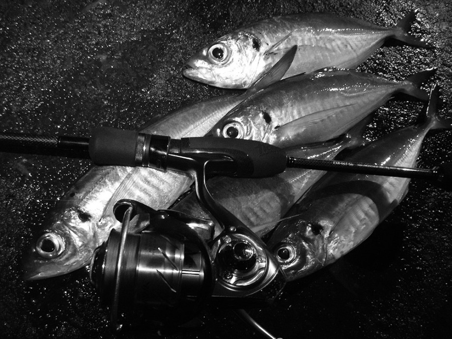 主にマヅメ時、キビナゴの群れを捕食するために接岸する大アジの群れ。