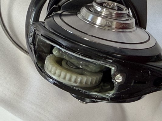 ローター上のシール、石突きの取り付けにワッシャが1枚足りない、ベールリターンローラーのスプリングが欠損、ピニオンとラインローラーはマグ抜け、と。どれも入手可能なので頼んどきますよ。