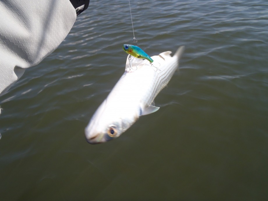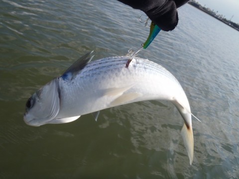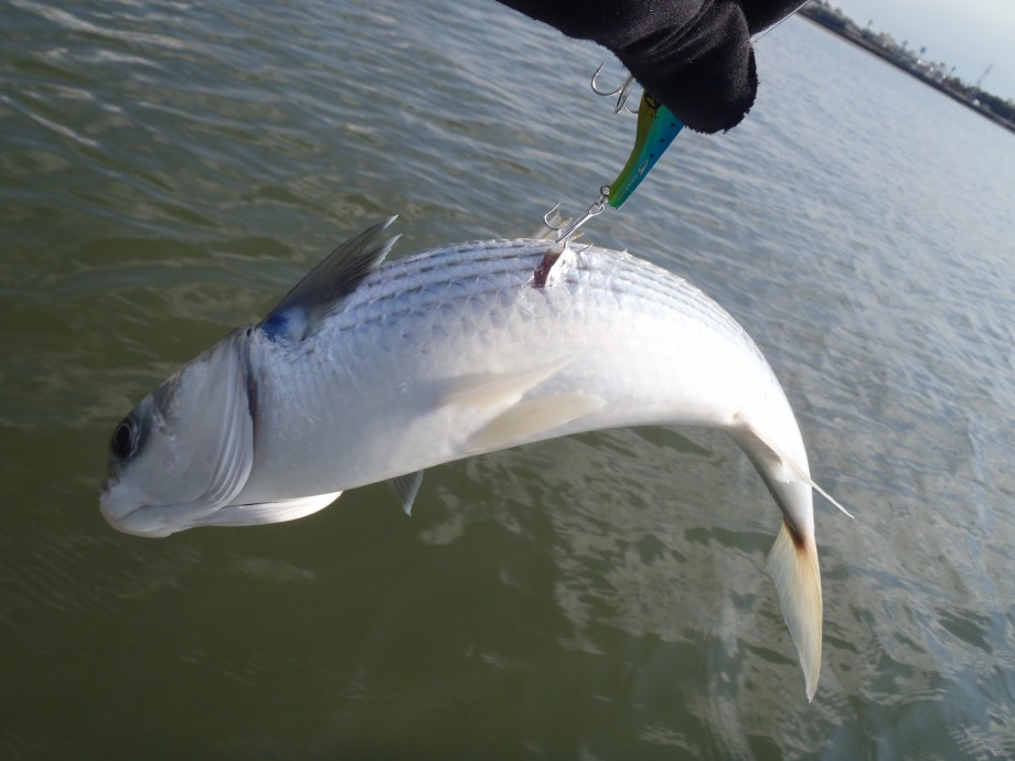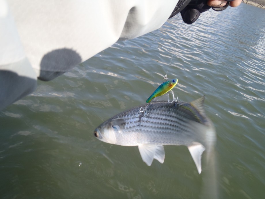 その後も底をズル引きしたり、早巻きを止めて、ゆっくりと巻いたり、大きくしたり小さくリフト&フォールしたり、色々試してみましたが、ボラ4本追加たあとに、フルキャストしたら、対岸を釣ってしまい(驚)終了としました。