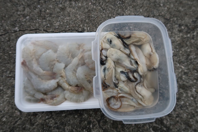 従って釣りに用いる餌もスーパーで手に入る牡蠣のむき身やバナメイエビ、アサリのむき身などを使っています。