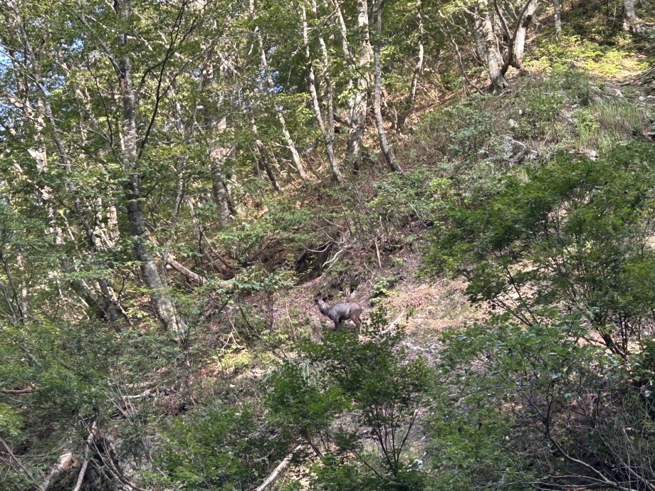 動物の気配を感じて目線をあげると立派なカモシカがこちらを見ながら通せん坊しております。