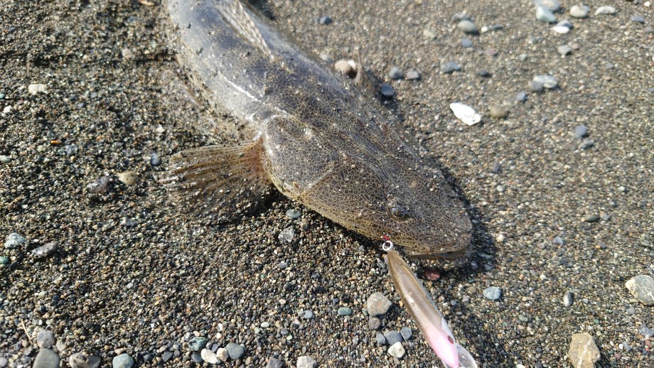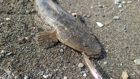 ラインを出され、回収してを何度か繰り返して波打ち際に姿を見せたのはマゴチ。