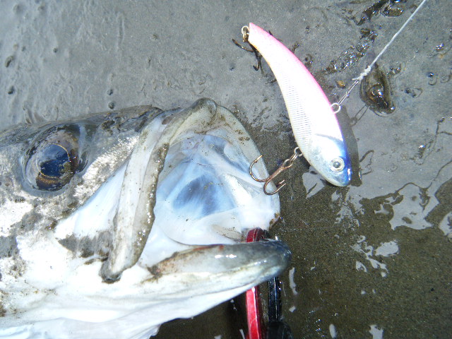 ロッドを砂浜へ投げ捨て・・・頭から飛び込み、魚に馬乗りになる。。。俺^^